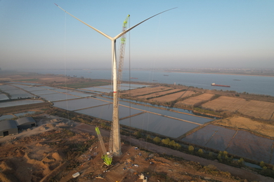 2021年11月30日,通能咨詢承監(jiān)的彭澤縣核電帽子山分散式風電項目完成國內首臺八邊形超高混塔風機吊裝,為公司在新能源領域的發(fā)展開啟了新篇章。
