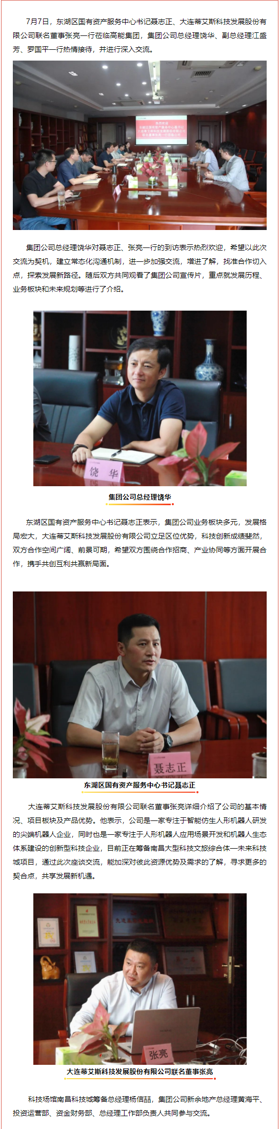 東湖區(qū)國有資產服務中心書記聶志正、大連蒂艾斯科技發(fā)展股份有限公司聯(lián)名董事張亮一行蒞臨高能集團參觀交流