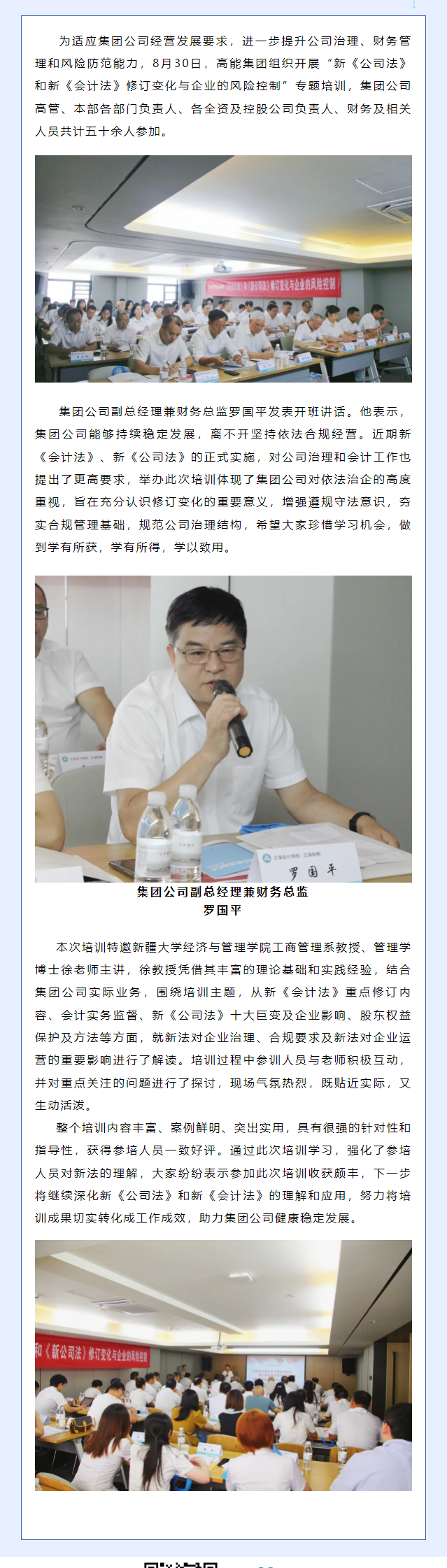 高能集團(tuán)開(kāi)展“新《公司法》和新《會(huì)計(jì)法》修訂變化與企業(yè)的風(fēng)險(xiǎn)控制”專(zhuān)題培訓(xùn)